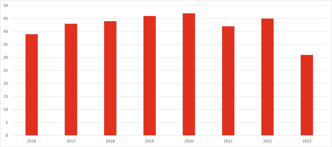 Mellan 2016 och 2023 har SBFF hanterat totalt 337 händelser med drunkningsolyckor inom medlemskommunerna. Diagrammet visar hur antalet drunkningsolyckor fördelar sig mellan åren. I statistiken ingår förutom badrelaterade olyckor även olyckor som sker med båt och vid fiske och isaktiviteter.
